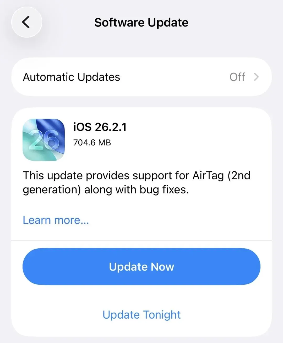 iOS 26.2.1 于上周正式推送,本次更新除新增对 AirTag 2 的支持外,还包含了常规的系统漏洞修复。不过,部分用户反馈,更新后非但没有解决问题,反而出现了新的系统异常。