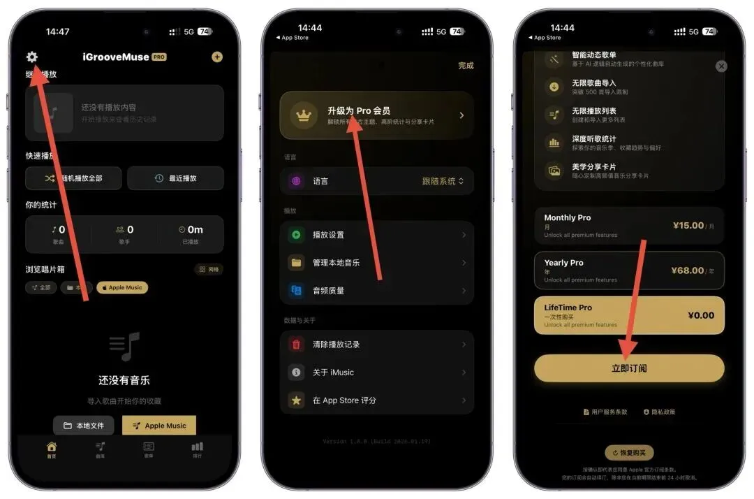 1,打开软件,进入主界面后,点击左上角按钮进入设置3,进入内购界面,选择「一次性购买 ¥0.00」订阅即可
