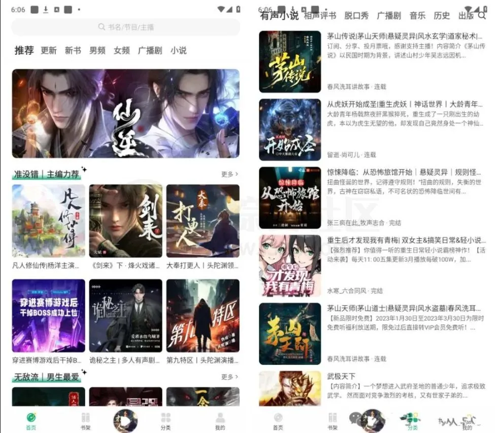 有声小说、漫改作品、经典相声、名家评书、爆笑脱口秀、优质广播剧、治愈音乐、历史纪实…… 应有尽有!而且全是真人发声,声线丰富多样,不同角色有专属配音,听着就像说书人在身边现场演绎,代入感超强,越听越上头!
