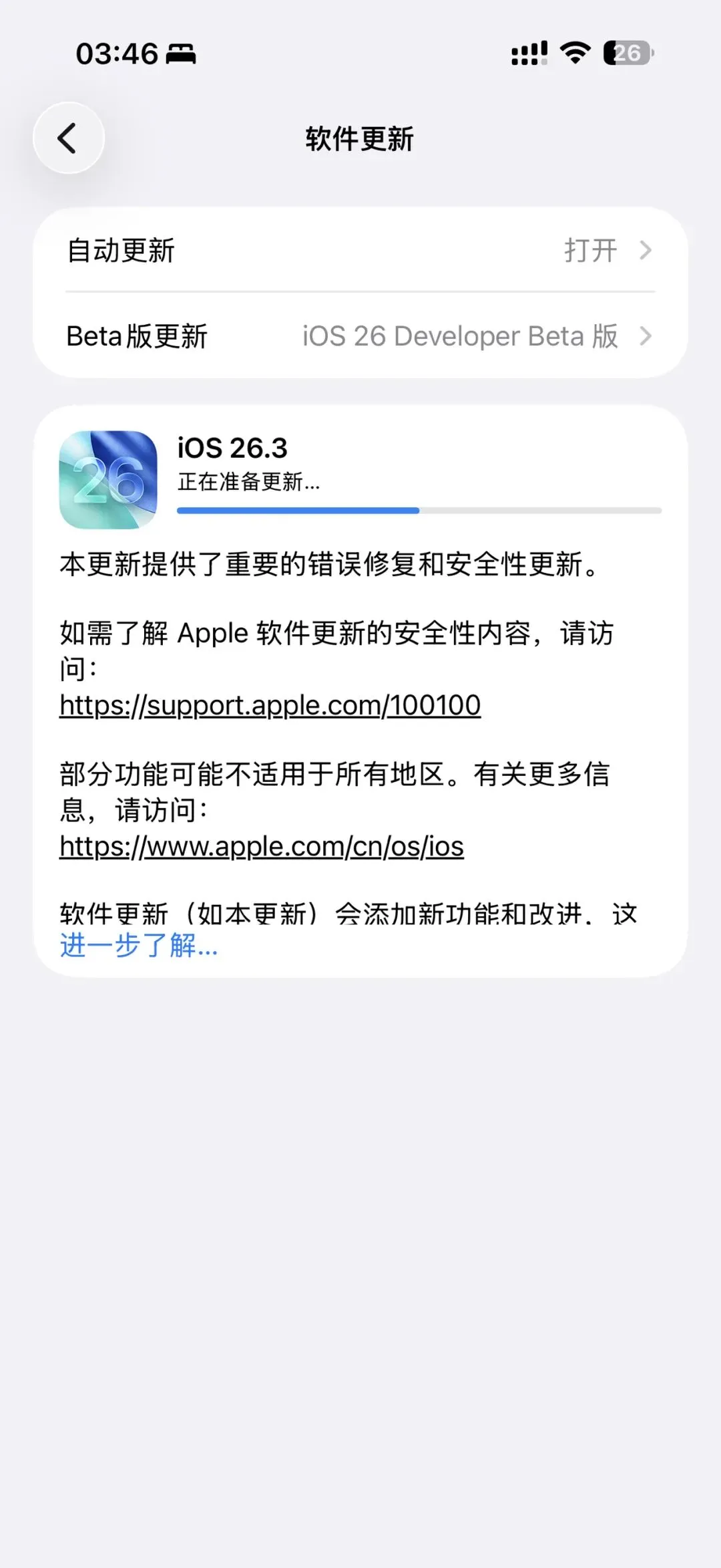今天凌晨,苹果终于推送了 iOS26.3RC 最终版更新,当然一起发布的还有Mac、平板、TV 、watch、头显设备的RC版本。