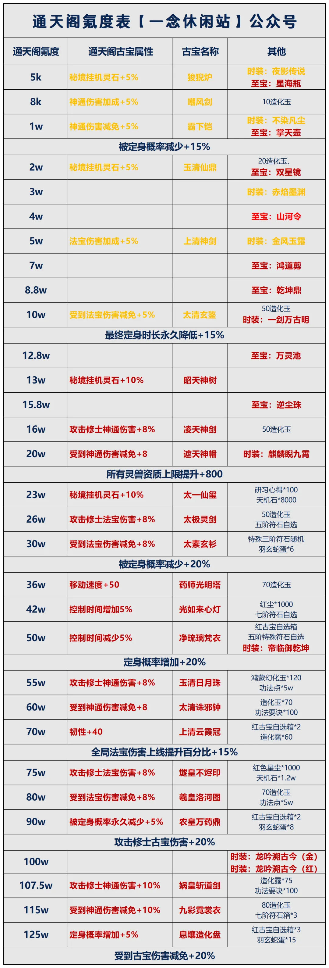 每60抽可以获取5造化玉,而折算下来相当于每个月抽完造化图的情况下可以获取5个造化玉,这边目前还没有看到上限,而持续抽一年的造化池也能获取60个造化玉!另外今年官方也表示没有出新至宝的打算,如果差十几二十个玉升级的不妨将目光投向这里。这边达到指定氪度将赠送造化玉,当然各位道友不可将至宝的升星希望放在通天阁累充上,这只能是意外之玉!