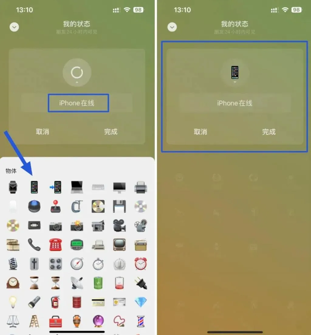 我们可以将状态词设置为“iPhone在线”,然后点击上方的圆形状态图标,就能选择表情,在物品一栏找到iPhone的表情添加。