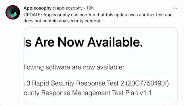 至于具体修复了什么,有什么功能更新,苹果还没有发布更新日志,但外网官方账号给出的说明是:此更新是另一个测试,不包含任何安全内容。