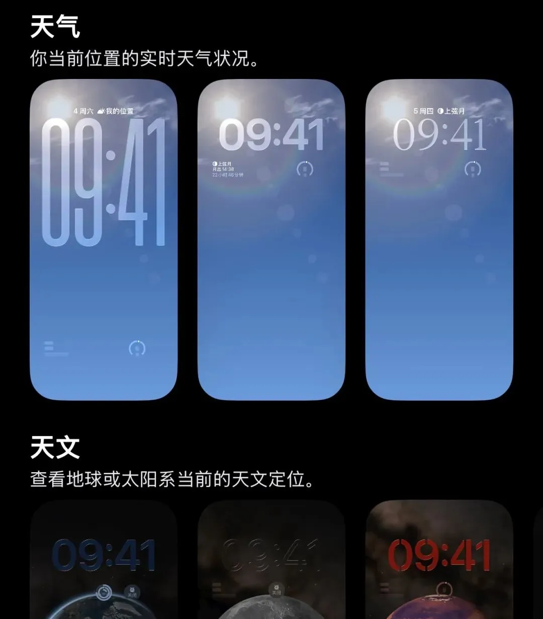 - 天气壁纸独立板块:锁屏壁纸设置中,原"天气与天文"合并类别被拆分,"天气"壁纸独立为专属板块,提供3款预设动态壁纸