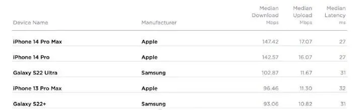 另外,各设备的中位下载速度上,iPhone 14 Pro Max 以 147.42Mbps 的速度领先,iPhone 14 Pro 以 142.57Mbps 速度位居第二。