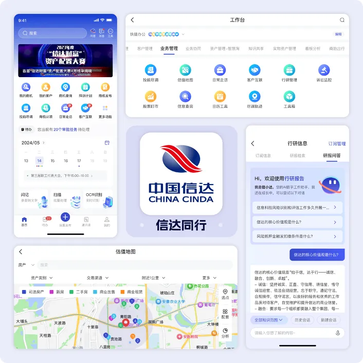 “信达同行”APP围绕用户移动办公旅程和实际场景,小步快跑,持续迭代推新。针对现场尽调、走访调研等外勤办公需求,支持移动端与PC端等多渠道一体化流程协同,解决数据资料跨平台流转“卡壳”与重复上传问题,集成工商、诉讼、不动产等外部数据及内部行业研报,实现外部资源信息一键查询,支持业务人员随时随地完成业务操作,推动业务全流程向“指尖化”便捷体验升级。根据用户需求和痛点,嵌入估值地图、行研报告检索、语音转译、文字提取和纪要生成等智能工具,有效提升信息采集与录入效率,为业务分析决策提供便捷支撑。