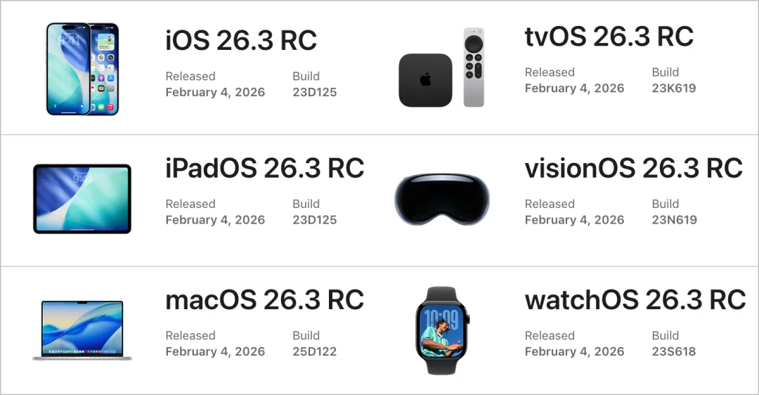 苹果今天(2 月 5 日)向参与测试的用户推送了 iOS 26.3 RC 版,同时到来的还有 iPadOS、watchOS、macOS 等系统的 26.3 RC 更新。