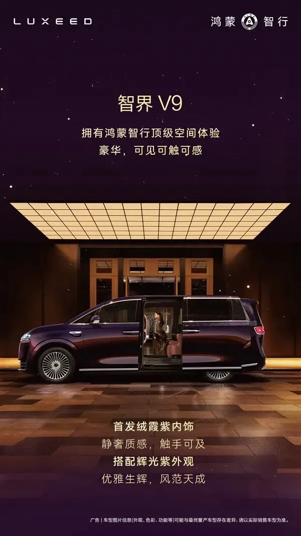 智界汽车今日又公布了智界V9的座舱官图。据介绍,智界V9首发绒霞紫内饰,搭配辉光紫外观,整车内外看上去很是雍容华贵。