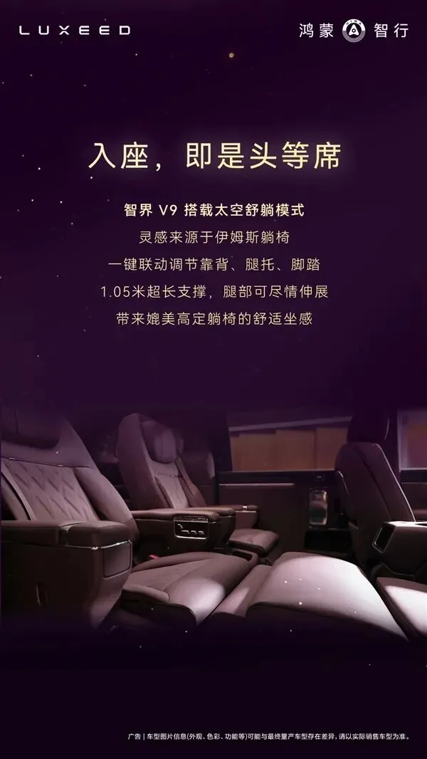 二排座椅搭载太空舒躺模式,键联动调节靠背、腿托、脚踏,1.05米超长支撑,腿部可尽情伸展。