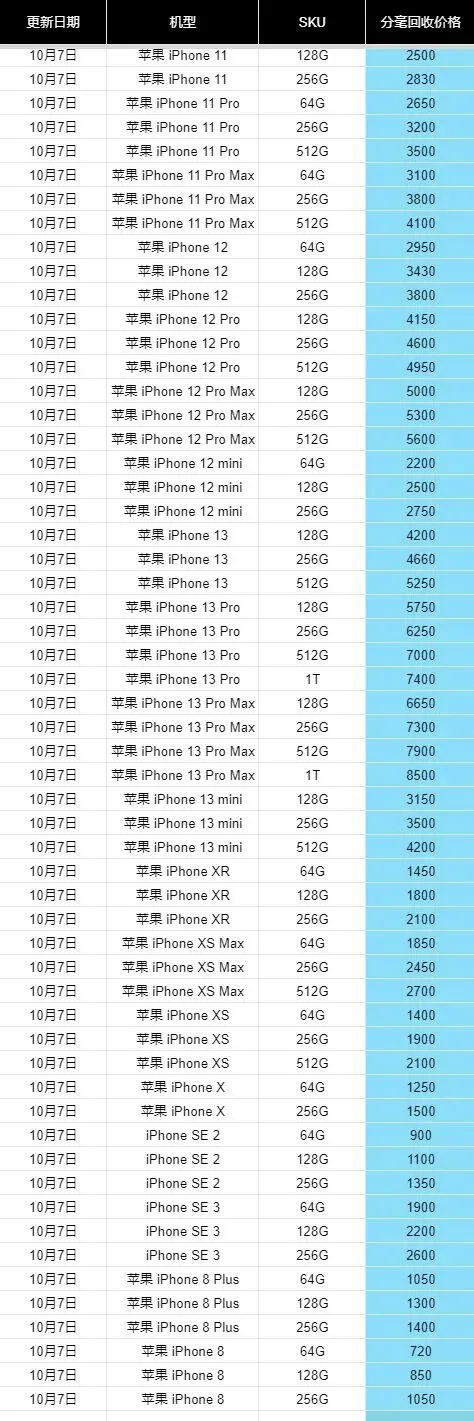 二手手机回收报价清单
