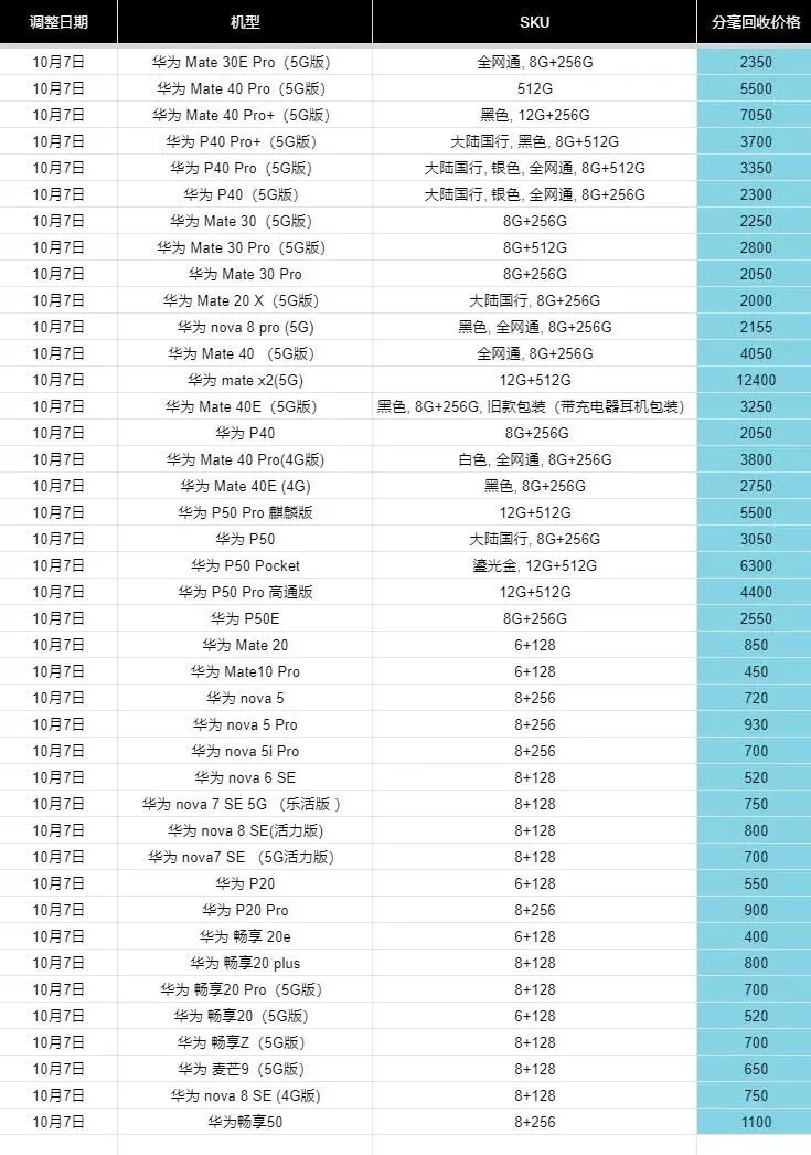 #华为热门二手手机回收报价清单