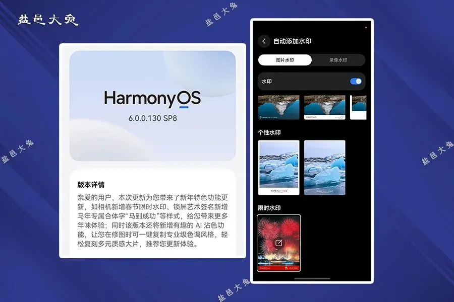 2月4日晚间,对我Pura70手机鸿蒙6.0系统进行版本更新,该版本为6.0.0.130 SP8,以2026新年主题为特点,在相机拍摄、图库修图等多个常规使用场景下增加新功能。