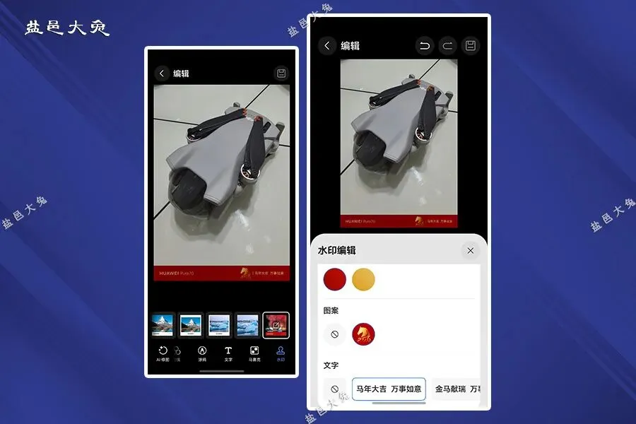 使用手机相机拍照,通过设置选项提前开启水印功能,便可使用这个春节限时水印。主要包括手机型号、马年LOGO、祝福语(默认值为“马年大吉 万事如意”)、背景色系等四个部分,并支持对后面三项进行调整,以满足用户个性化需求。