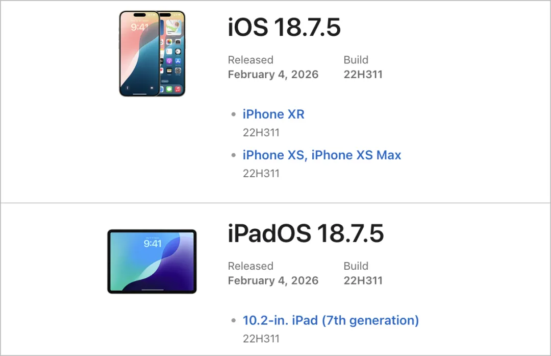 iOS18.7.5RC版本号为22H311,也是安全更新和系统 bug 修复,修复 iOS 18.7.4 出现了移动网络的bug,iOS 18.7.5 RC 主要适配 iPhone XR、iPhone XS、iPhone XS Max 设备无法升级 iOS 26 的老机型。