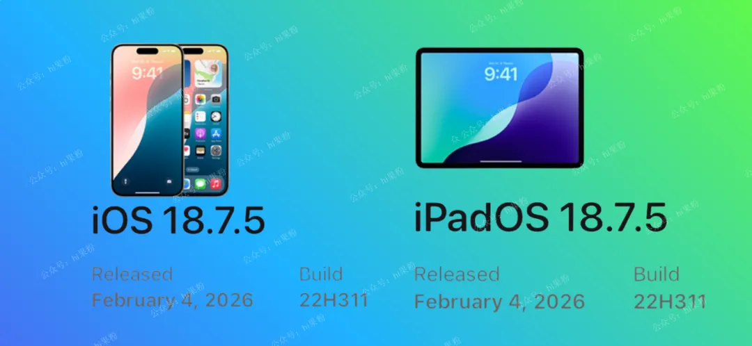 hi果粉:今天,苹果向 iPhone 和 iPad 用户推送了 iOS / iPadOS 18.7.5 RC(版本号:22H311)