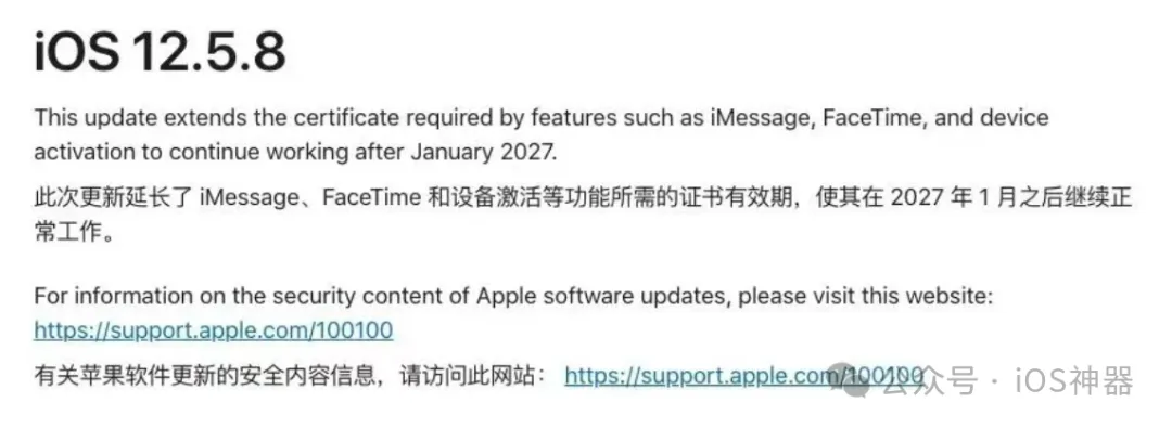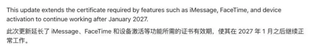 延长了 iMessage、FaceTime 和设备激活等功能所需的证书,以保证 2027 年 1 月后继续工作。
