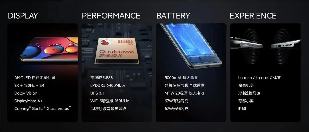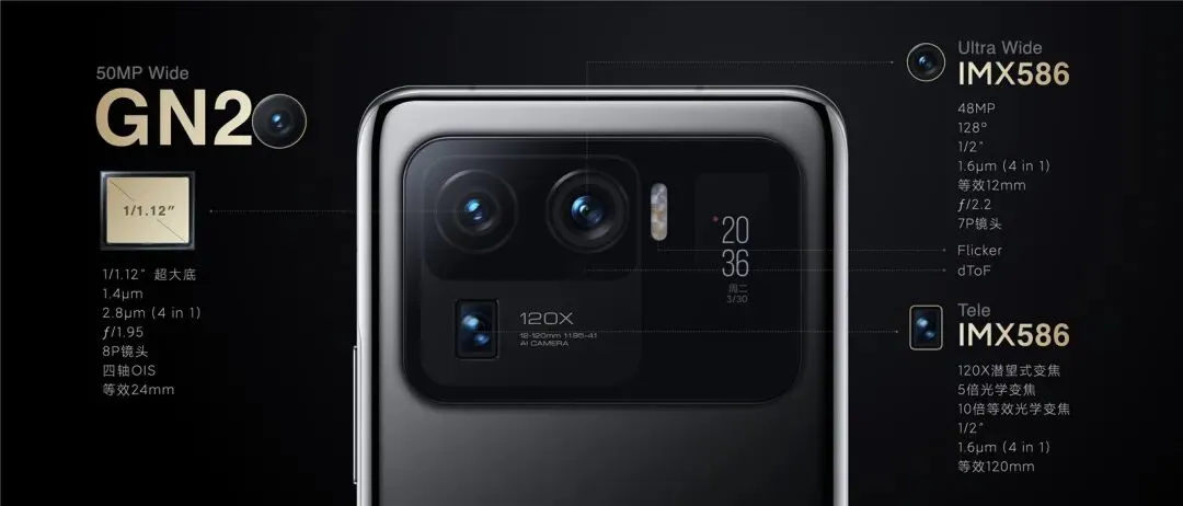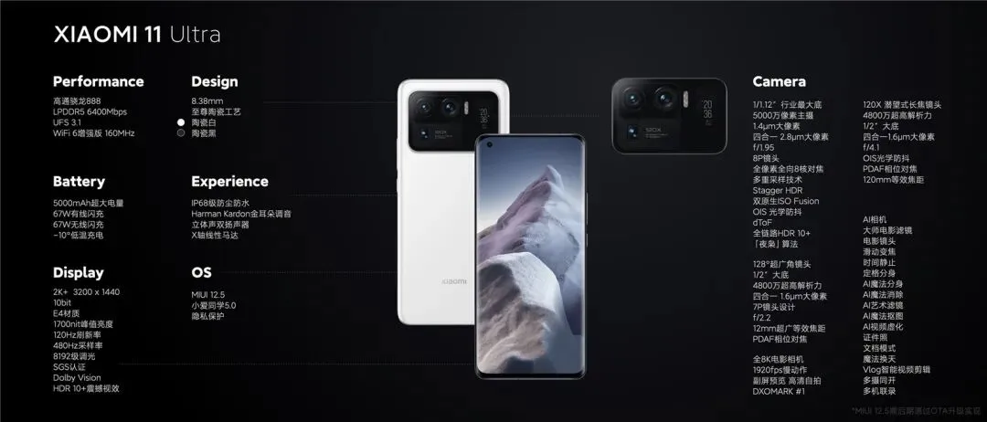 价格方面,小米11 Ultra 8+256GB版5999元、12+256GB版6499元、12+512GB版6999元,今晚预售,4月2日正式开售。相比大杯,小米11 Ultra外形有着非常大的变化,后置矩形相机模组,占比巨大,几乎是机身的三分之一面积,除了镜头模组以外,还有一块副屏,支持息屏显示、消息通知、拍照辅助等。官方表示,这有可能是“辨识度最高”的小米手机,首发高透泄压阀,全系精密陶瓷工艺,提供陶瓷黑、陶瓷白两种配色,此外还有大理石纹特别版,厚度为8.3mm。既然是巅峰影像,那么相机是最重要的升级之处,后置三星GN2主摄(50MP、1/1.12、四轴OIS、1.4μm、4in1 2.8μm、8P)+IMX586超广角(48MP、128°、7P)+IMX586潜望式长焦(5X光变、10X等效光学变焦、120X数变)。与此同时,该机后置还有dToF,64点阵激光对焦,内置小米自研“夜枭”超级夜景算法,号称手持拍照超越长曝30秒画质水准,支持全主摄全8K。官方拿小米11 Ultra的后置相机对比了索尼黑卡(RX100M7),而且不落下风,号称拐点之战。功能方面,小米11 Ultra支持全链路HDR10+、多机联录、音源追焦、大师电影滤镜、视频LOG模式等特性。核心配置上,新机依然采用6.81英寸2K+120Hz高刷屏,搭载骁龙888+LPDDR5内存+UFS 3.1+新型相变导热材料。电池和中杯一样5000mAh的硅氧负极电池,支持67W有线/无线快充,均是36分钟充满。其它配置变化也不大,诸如立体双扬、IP68防尘防水、X轴横向线性马达、NFC+红外遥控等特性。另外需要注意的是,雷军表示今天并非全部新品,明天晚间7点半继续发布会,届时小米MIX、澎湃芯片将一一亮相。