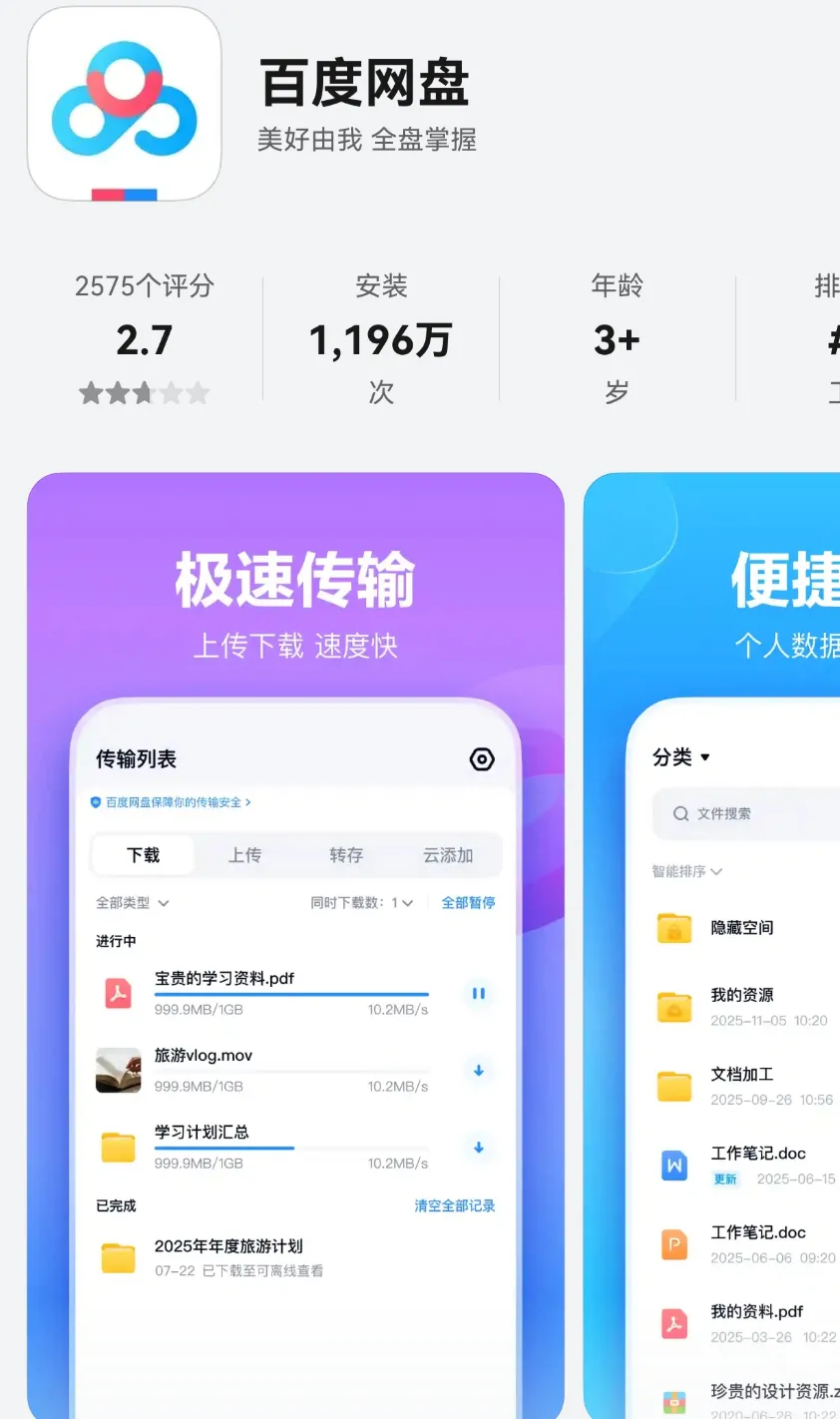 本次更新如下:1、文件列表排序优化,文件排列更清晰,查找文件更高效;2、首页视觉全新升级,更加简洁清晰,快来体验吧;3、音频支持定时关闭啦听多久你说了算4、小说、笔记功能焕新上线,书架、进度记录应有尽有;5、GenFlow(原云一朵)也端上来啦,一句话整理、搜 索、总结文件,快去体验网盘最新的AI功能吧!