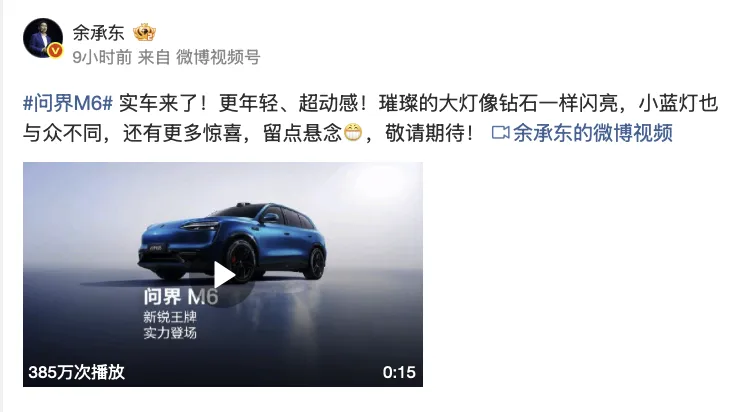 2月3日,余承东通过社交媒体发布了问界M6的实车视频,顺势把问界家族最新的一块拼图推到了台前。