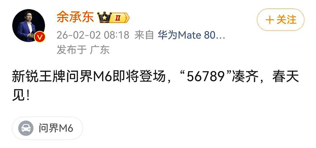 而对于背靠赛力斯制造体系和华为智能技术的问界来说,即将到来的M6更像是一轮面向年轻市场的“快攻”——用更锋利的造型、更强的智能预期,把热度提前写进春天。