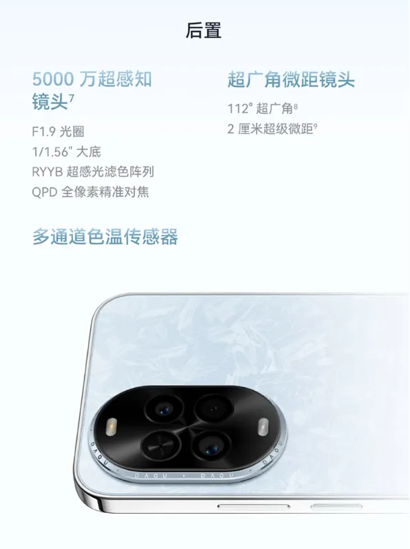 前置5000万超清人像镜头,配备1/2.5英寸超大底传感器,进光量较上一代提升30.8%,暗光自拍也能清晰通透、细节拉满。更搭载华为达芬奇人像主题,提供原生、质感、妆感三套美颜方案,结合AI修图2.0功能,支持AI人像精修、AI魔法移图,一键优化光影、虚化背景,甚至能智能抠取画面元素跨图融合,不用专业修图技巧,也能拍出杂志级质感。