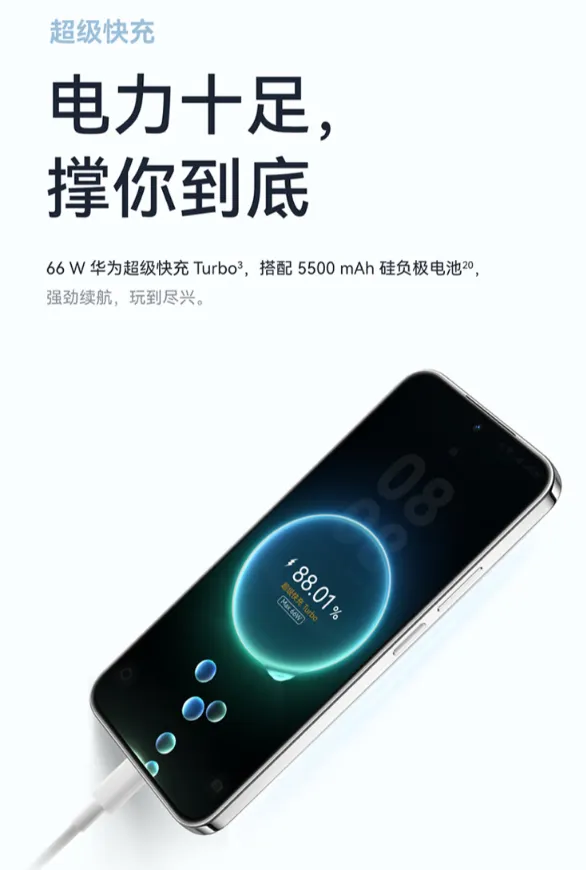 续航短板从来不是nova14活力版的困扰。内置5500mAh大容量硅负极电池,日常刷视频、聊工作、逛社交软件,轻松支撑一整天重度使用,告别“电量焦虑”。搭配66W华为超级快充Turbo,无需长时间等待,碎片时间就能快速补能,出门前快充10分钟,就能满足通勤路上的使用需求,彻底解决“出门没电”的痛点。同时支持智能调控充电策略,兼顾快充速度与电池健康,长期使用也能保持稳定续航。