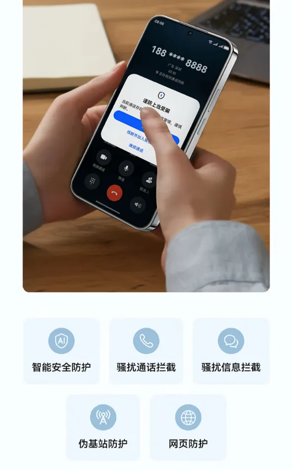 安全防护更是拉满,搭载AI通话防诈功能,接通陌生来电后,一旦识别为诈骗便会振动弹窗提醒,搭配骚扰拦截、伪基站防护、隐私安全中心等功能,全方位守护用户的通信安全与隐私[2]。隐私灯设计更显贴心,当应用访问摄像头、麦克风等敏感权限时,会及时发出提示,让隐私安全尽在掌控。
