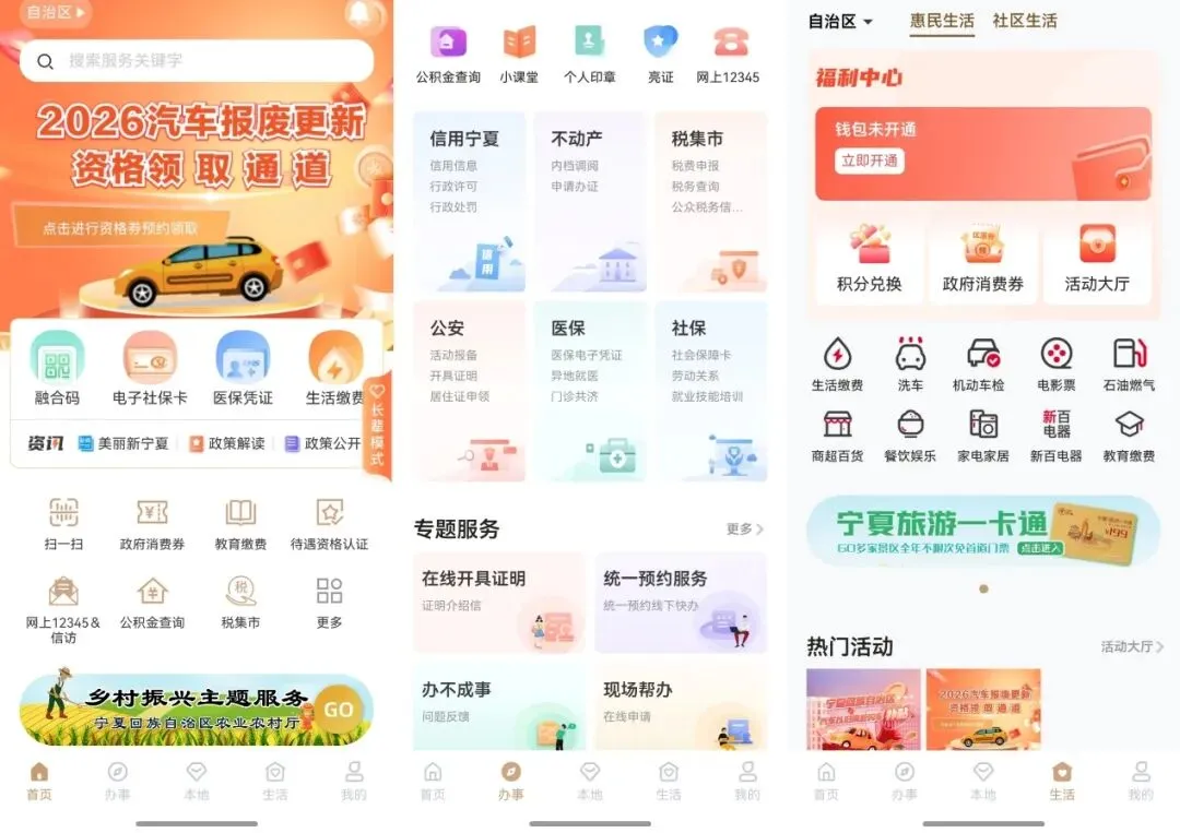 就说我所在的宁夏吧,去年初的鸿蒙版“我的宁夏”真的让我两眼一黑,除了亮个医保码、电子社保卡,领个消费券,其他功能基本上可以说“查无此人”。直到最近我查去年的公积金缴存记录,顺手点开了它,好家伙,居然给了我惊喜!首页、办事、本地、生活、我的——五大核心版块全齐了,该有的功能一个不落,可以说跟我原来用的安卓版没啥区别。