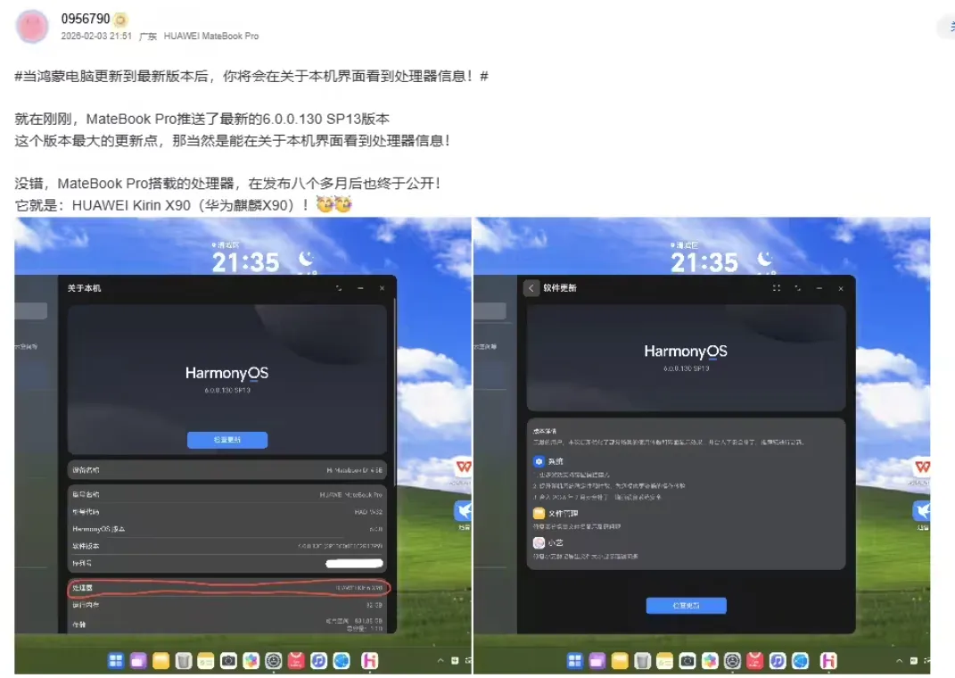 最关键的是,升级完成后,用户只需打开电脑“关于本机”页面,就能清晰看到处理器型号——HUAWEI Kirin X90,也就是大家所说的麒麟X90,彻底打破了此前关于鸿蒙电脑处理器的各种猜测。