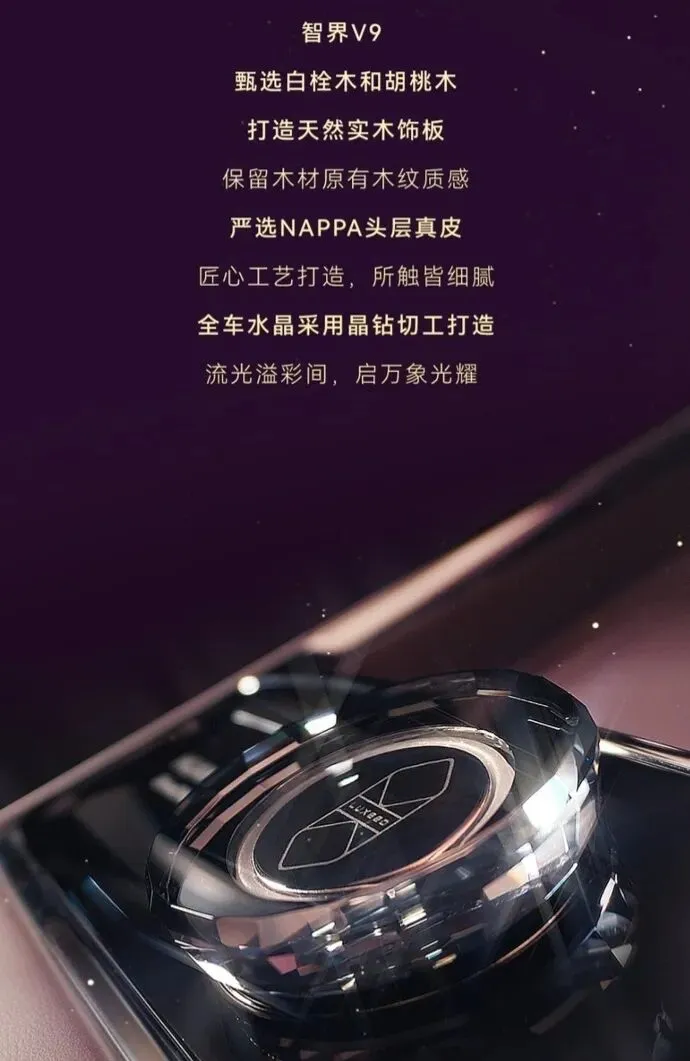 不少新车内饰要么亮面反光刺眼,要么塑料感明显,智界V9则走了一条更克制的豪华路线: