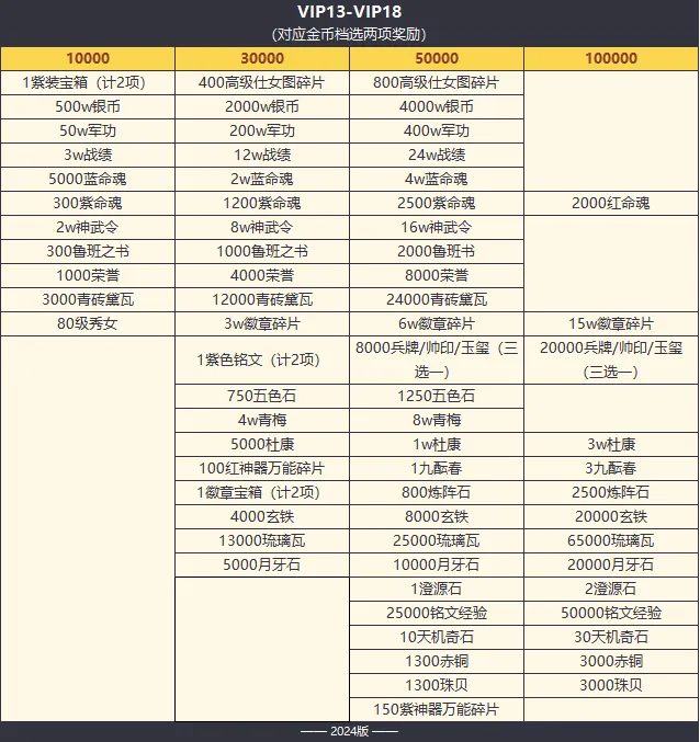 VIP13-VIP14角色:10000杜康酒+600w银币+60w军功