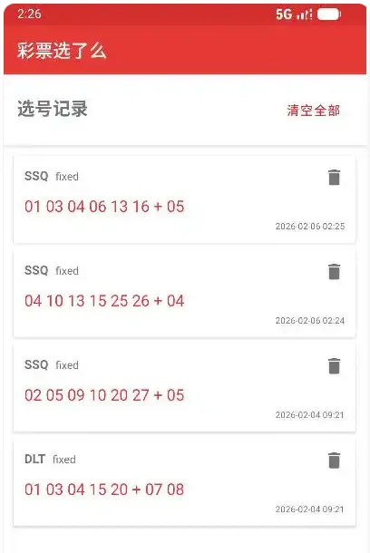 选号记录自动存,不怕遗漏:所有选号结果(无论哪种玩法)自动本地保存,支持单条删除、一键清空,再也不用手动记号、写纸条,随时查看历史选号。