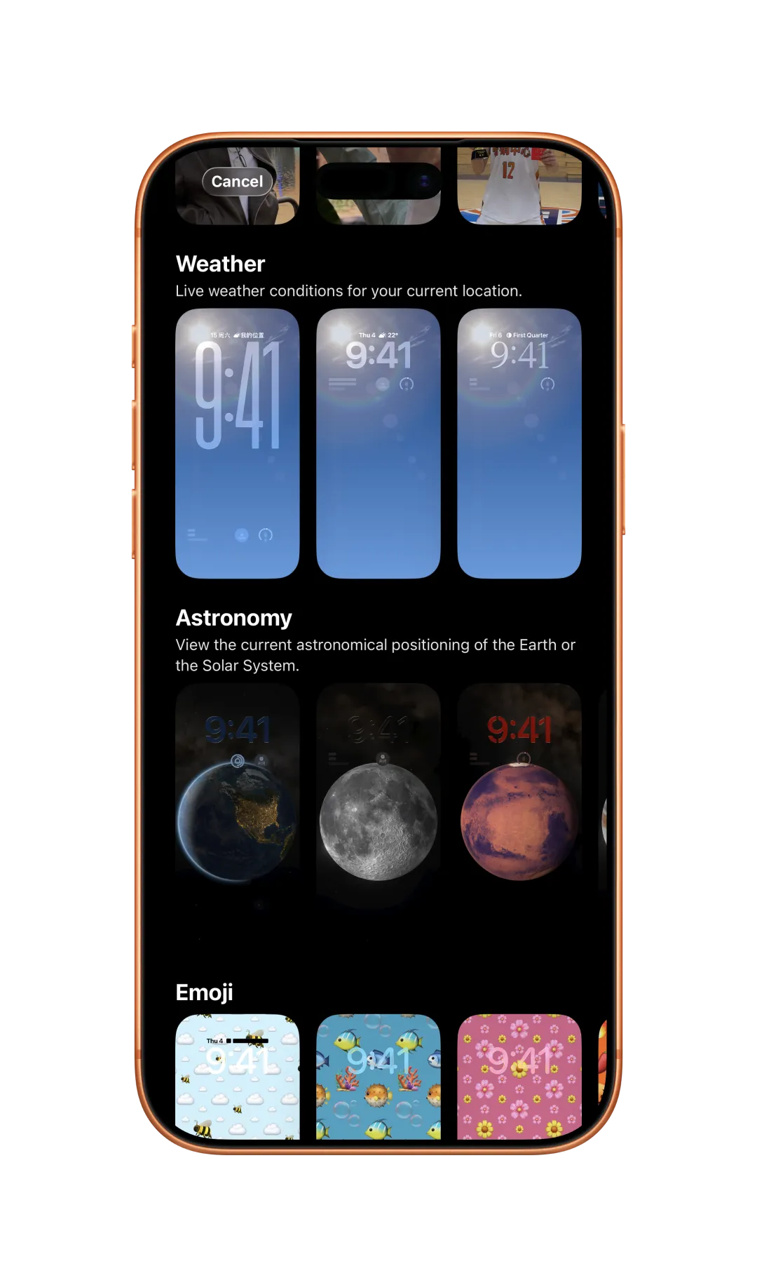 壁纸设置里,原来的"天气与天文"分类被拆分成了两个独立类别,选择更清晰。