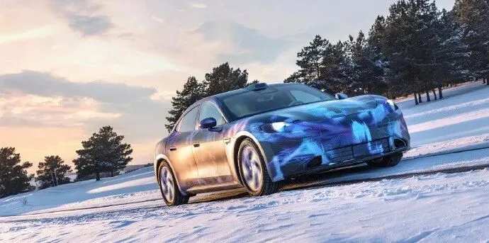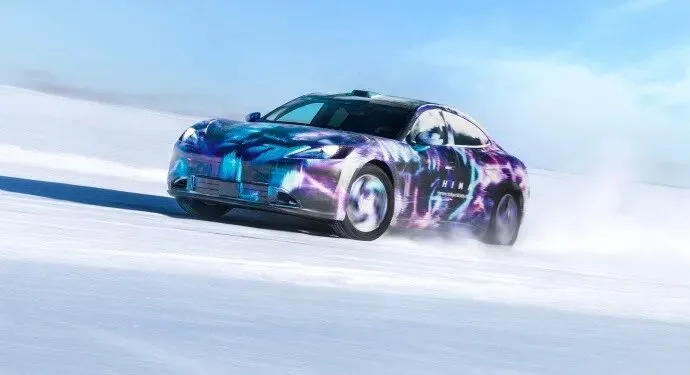 | 冰雪路面甩尾过弯的尚界Z7扬起一道雪雾,伪装车衣下流畅的车身线条预示着一款融合了华为技术与上汽制造底蕴的高端轿跑即将登场。