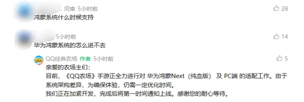 游戏界面显示“HarmonyOS NEXT版本正在开垦土地中,敬请期待”的提示。针对这一问题,游戏客服回应称,开发团队正在全力推进鸿蒙HarmonyOS NEXT系统的接入与调试工作。由于不同操作系统底层架构存在差异,适配优化仍需时间进行打磨。《QQ经典农场》的回归,也被视为QQ应对市场竞争的策略之一。近年,QQ移动终端月活账户有所减少;而微信月活已达14亿,且持续增长。