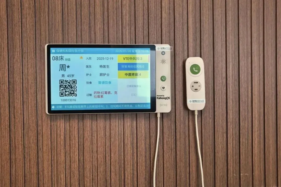 智慧病房联动:在病房应用中,当患者触发呼叫请求,系统即时联动床头屏、房门显示屏、走廊信息屏、护士站主屏及移动护理终端,实现多端同步响应;患者生命体征、护理行为等数据自动采集,并经加密通道安全同步至院内护理信息系统。