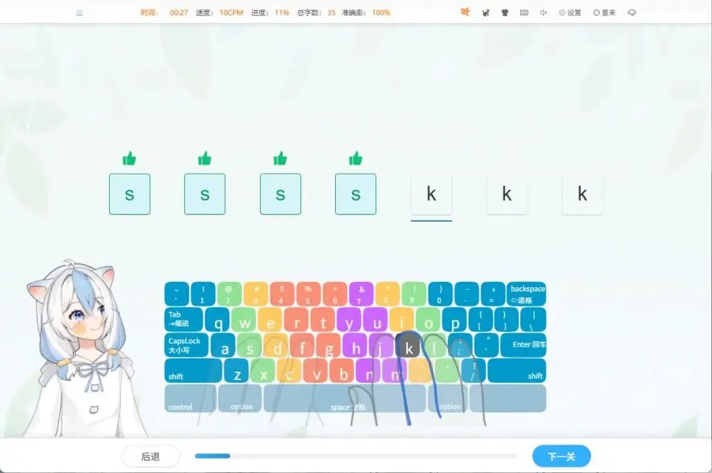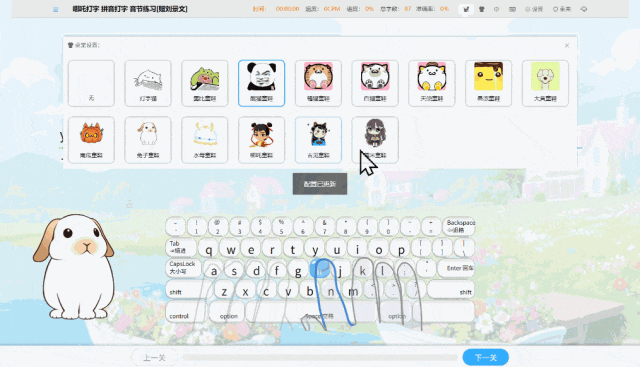 打字猫,名字就讨喜。主打闯关,每过一关就能解锁新猫咪、新道具,像集卡一样,特别有成就感。除了闯关,还有字母、单词、句子的专项练习,哪块弱就补哪块。速度和准确率都会记录,孩子自己能看到进步,我也能随时查数据。界面干净,操作简单,电脑、平板都能用,挺方便。