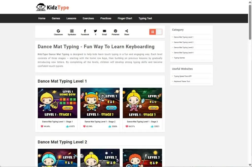 低年级的孩子,比如一二三年级,我推荐试试 KidzType。界面全是卡通动物、海盗船、宝藏箱,颜色又亮又鲜艳,孩子一打开就喜欢。练的词也简单,cat、dog、apple 这种,还有儿歌片段,不会一上来就被吓退。它有个 “舞蹈垫” 模式,分阶段学键位,每按对一个,小动物就跳个舞,孩子跟着动,玩着玩着就把键位记住了。