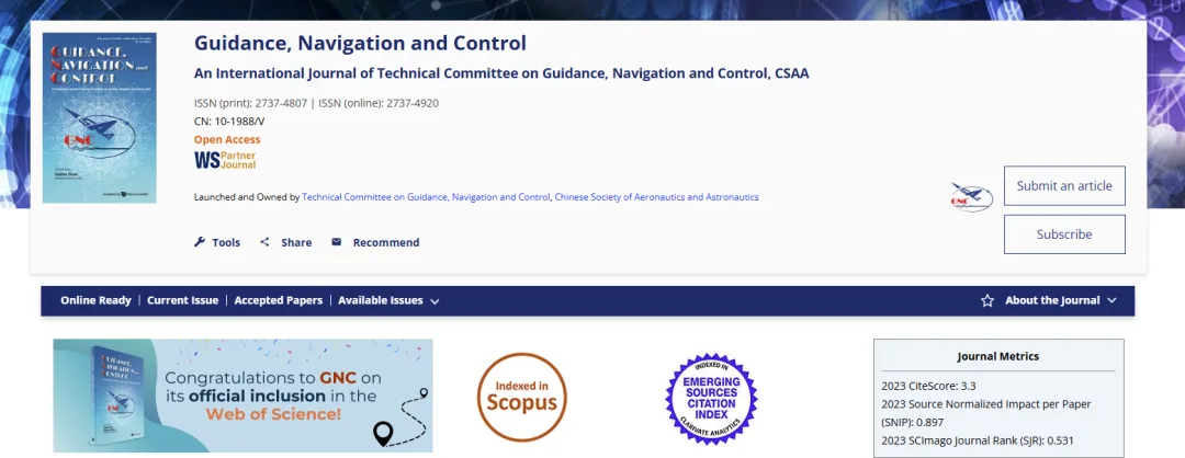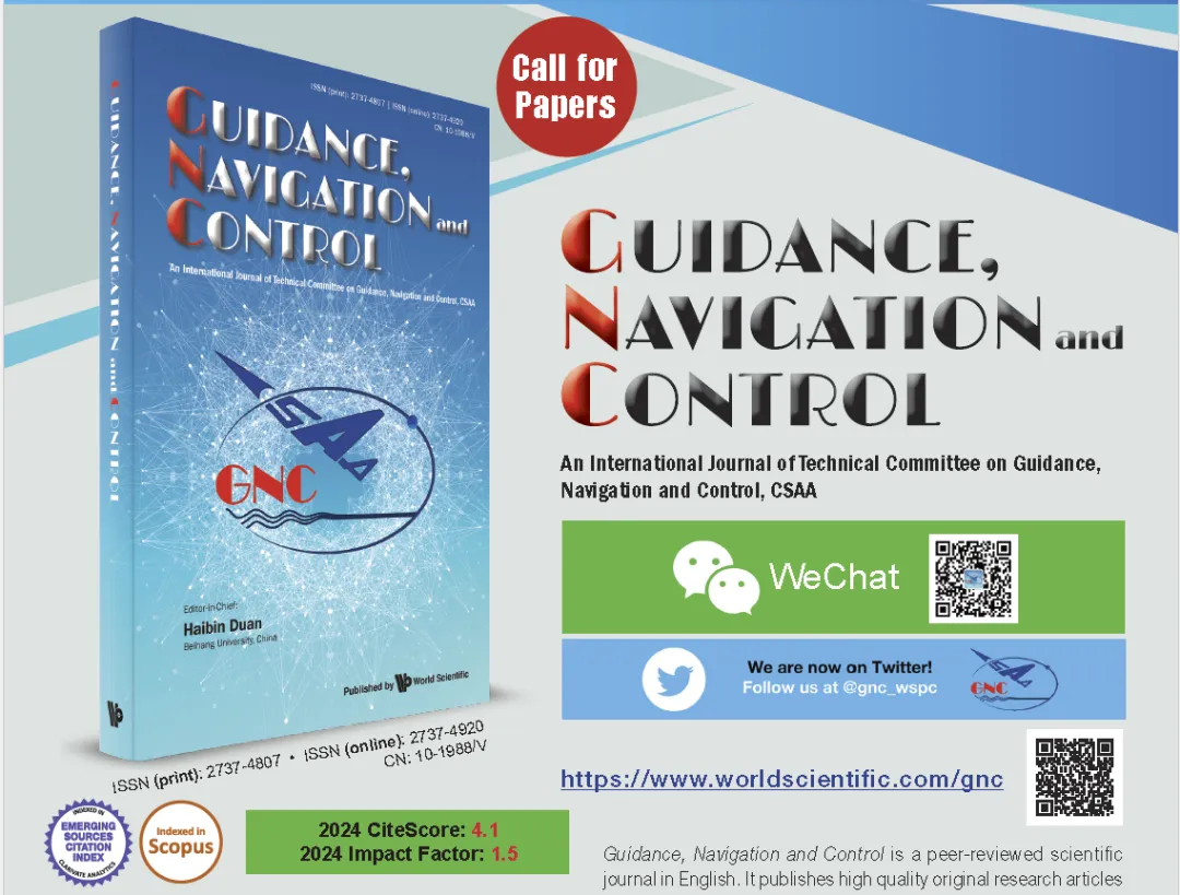 《Guidance, Navigation and Control》 (ISSN (print): 2737-4807 | ISSN (online): 2737-4920 | CN: 10-1988/V) 是第一本GNC领域的高质量国际学术期刊,季刊,是由中国科学技术协会主管、中国航空学会主办的学术期刊,新加坡世界科技出版社(World Scientific Publishing)出版,主要刊发制导、导航与控制领域科技发展新成果,推进转化应用,促进学术进步,服务新理论、新技术、新系统的发展。
