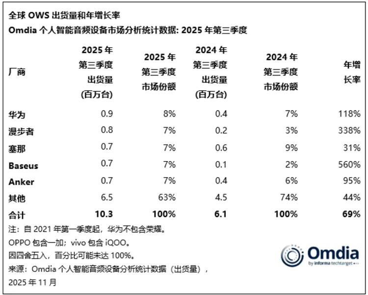2025年第三季度,全球开放式耳机的出货量直接冲破了1000万台,同比增长69%。