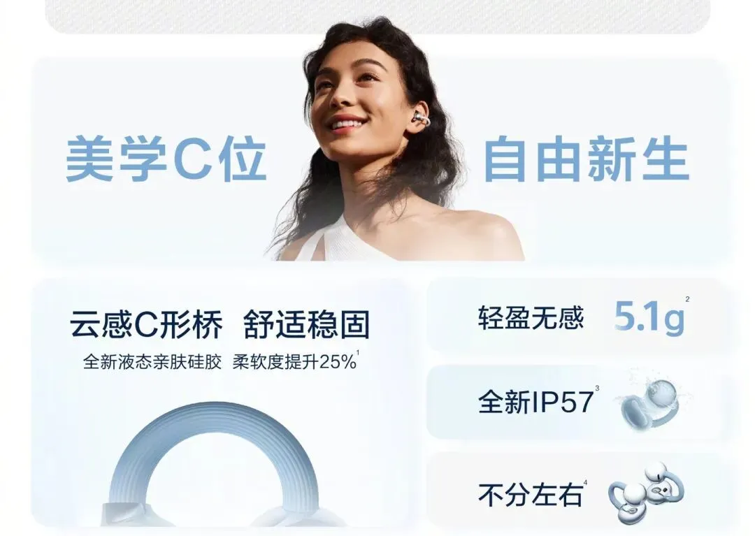 传统的耳夹式耳机往往夹得人脑壳疼,但华为这次学聪明了,FreeClip 2单只重量只有5.1克,轻得像是一张A4纸。