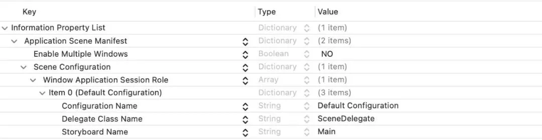 <key>UIApplicationSceneManifest</key><dict> <key>UIApplicationSupportsMultipleScenes</key> <false/> <key>UISceneConfigurations</key> <dict> <key>UIWindowSceneSessionRoleApplication</key> <array> <dict> <key>UISceneConfigurationName</key> <string>Default Configuration</string> <key>UISceneDelegateClassName</key> <string>SceneDelegate</string> <key>UISceneStoryboardFile</key> <string>Main</string> </dict> </array> </dict></dict>
