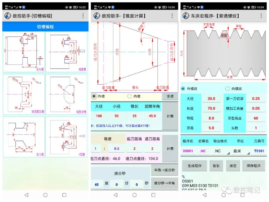 具有42项车床宏程序、37项节点计算、16项成型加工、18项切槽编程 等常用模板,具有角度计算、锥度计算、刀尖方位、普通螺纹等功能…