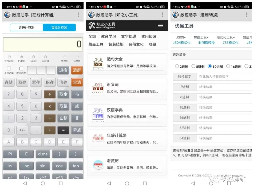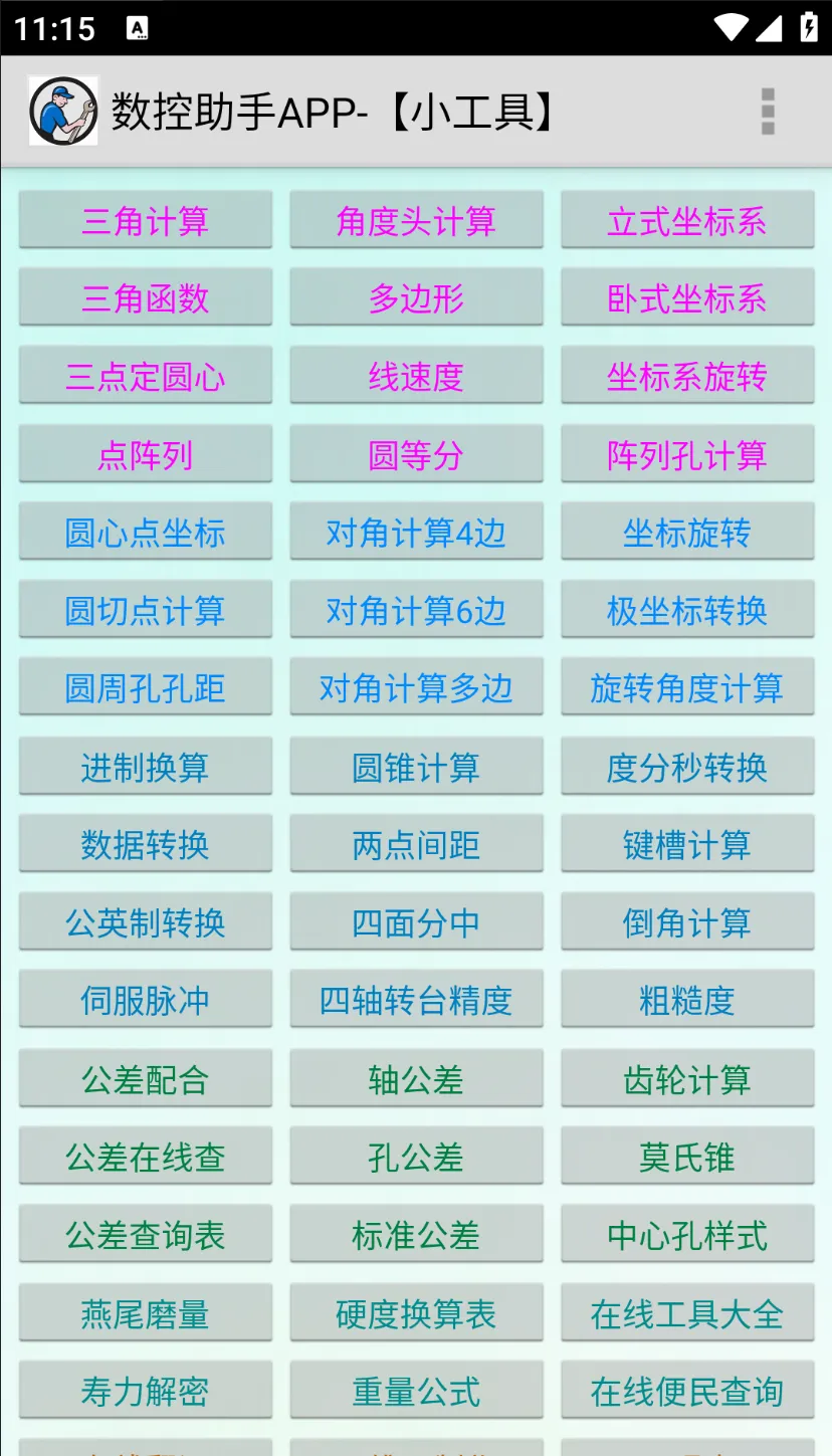 两点间距、三点定圆心、四面分中圆周孔孔距、极坐标转换、坐标旋转,坐标旋转计算器,多边形、圆心点坐标、进制换算、线速度、粗糙度、度分秒转换、圆锥计算、倒角计算、重量公式、公英制转换燕尾磨量、攻丝扭矩、特种作业证查询、美国寿力解密、等功能。