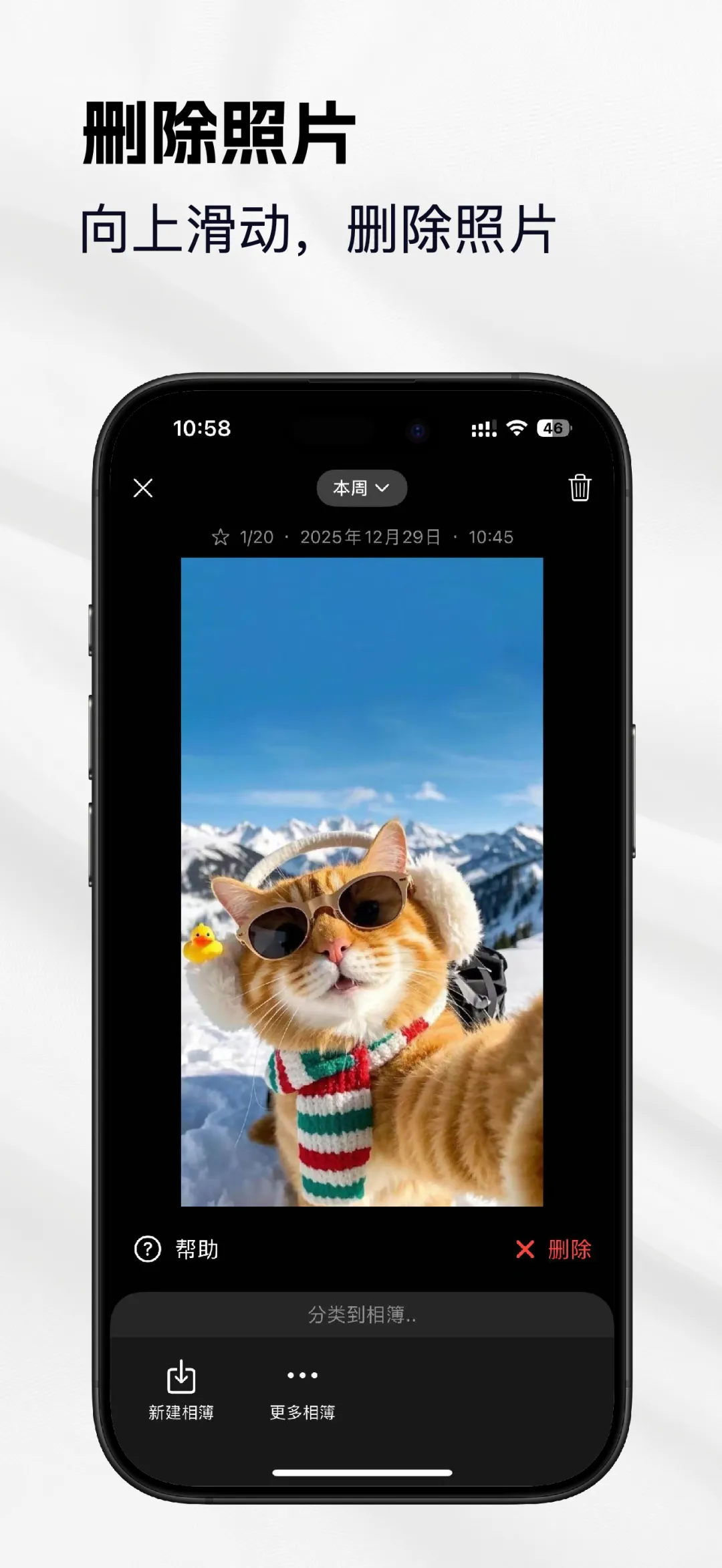 删除:轻轻一划,快速移除不需要的照片,这里注意是往上滑动删除,左右时切换游览照片。