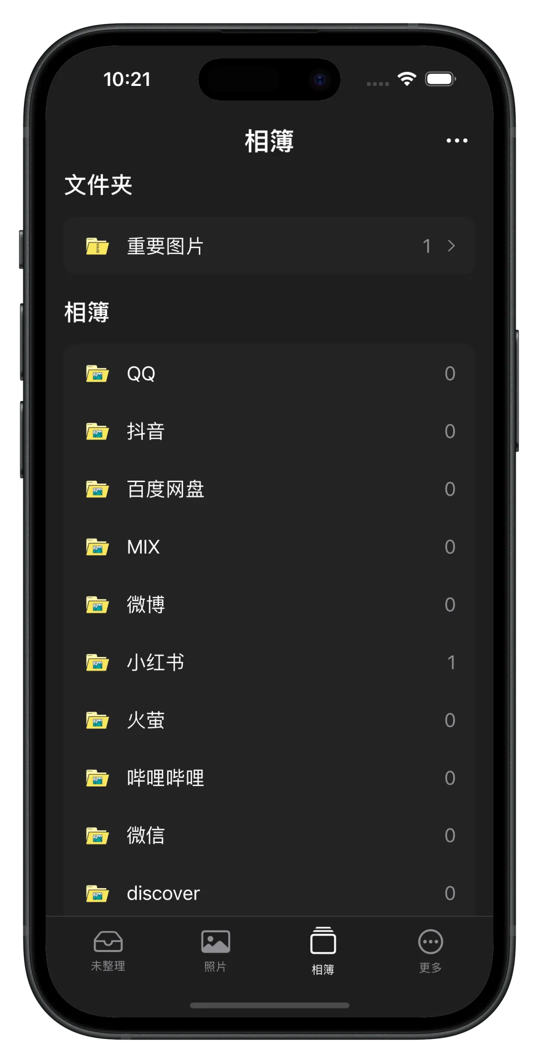 相册管理:文件夹与相簿多层级分类,照片各归其位,如照片,live图,视频,我的收藏,全都自动分好,感觉比手机相册还更好用更方便。