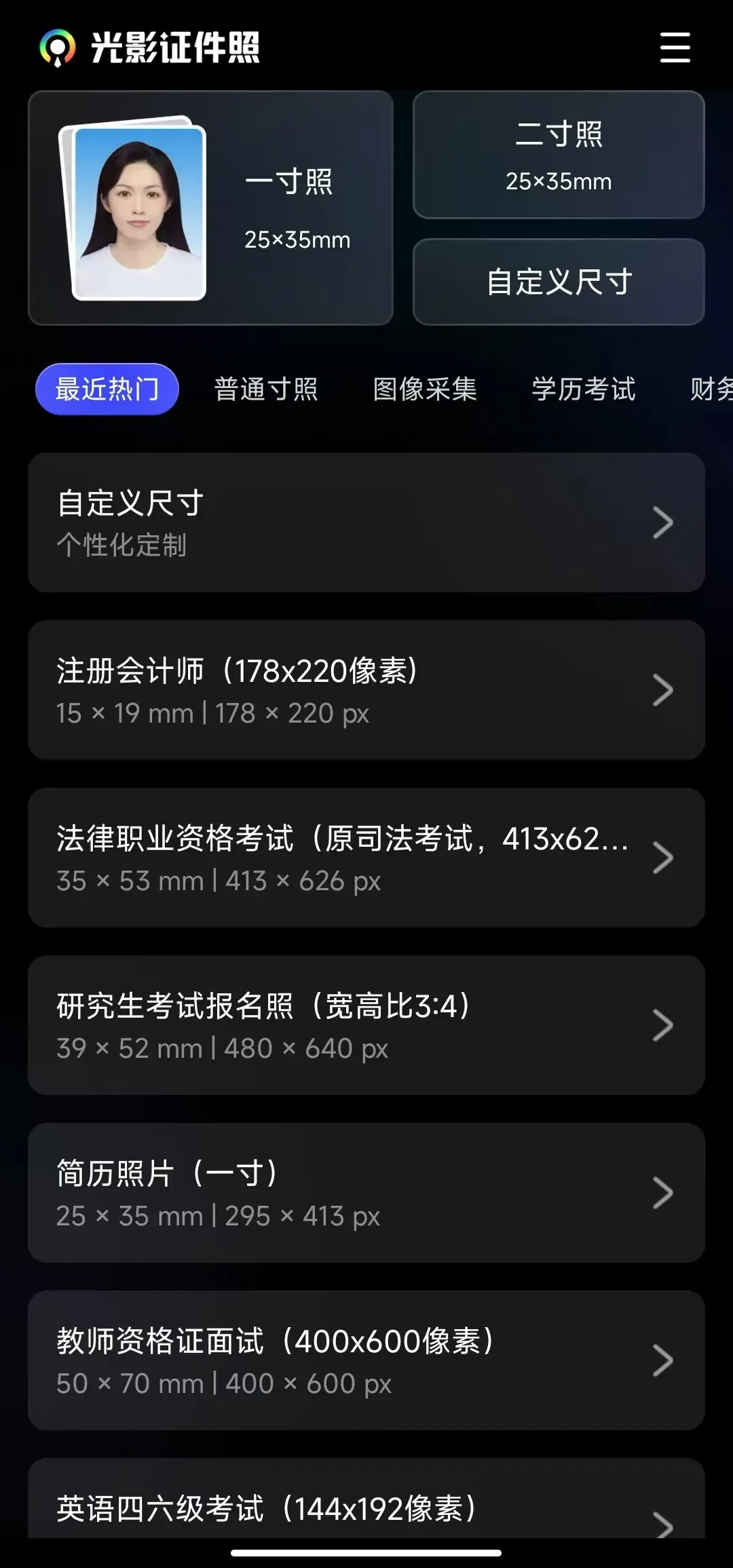 这款软件的功能特别贴合刚需,证件照制作需求基本都能满足:不仅覆盖了各种常规尺寸、各类证件办理、各类考试所需的证件照模板,还支持自定义尺寸,就算是有特殊尺寸要求的证件照,也能轻松搞定。进入照片编辑区后,还能一键设置照片底色,红底、白底、蓝底随心换,不用再费劲抠图改色,功能实用又强大。