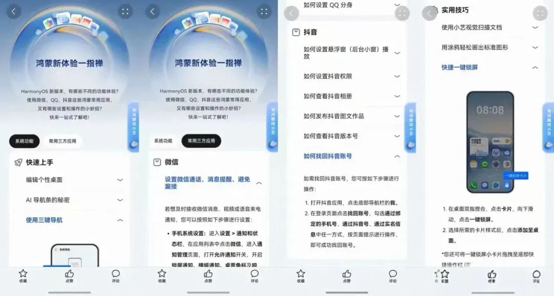 除了即时问答,对话页面下方的「鸿蒙一指禅」模块,还整理了“如何编辑个性桌面”“如何查看抖音相册”等常用系统功能设置和第三方应用使用攻略,闲暇时可以自行翻阅解锁功能。