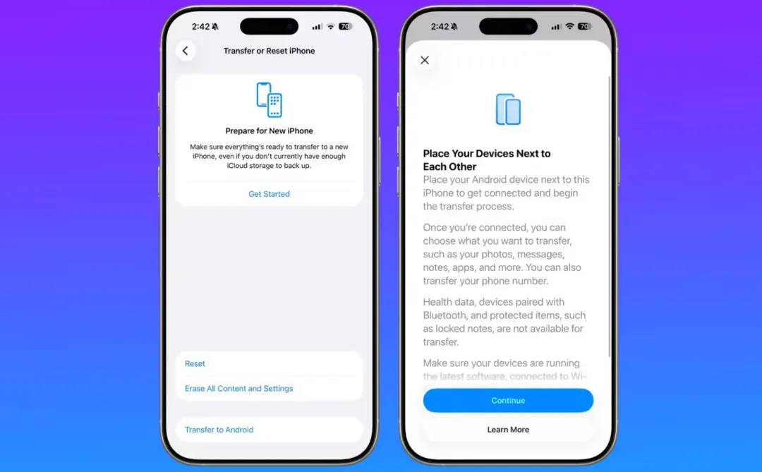 支持扫码或配对码两种连接方式,还原苹果生态内的无缝换机体验,仅部分敏感数据因隐私安全未纳入迁移范围。受欧盟《数字市场法案》要求,苹果还新增第三方穿戴设备通知转发功能。