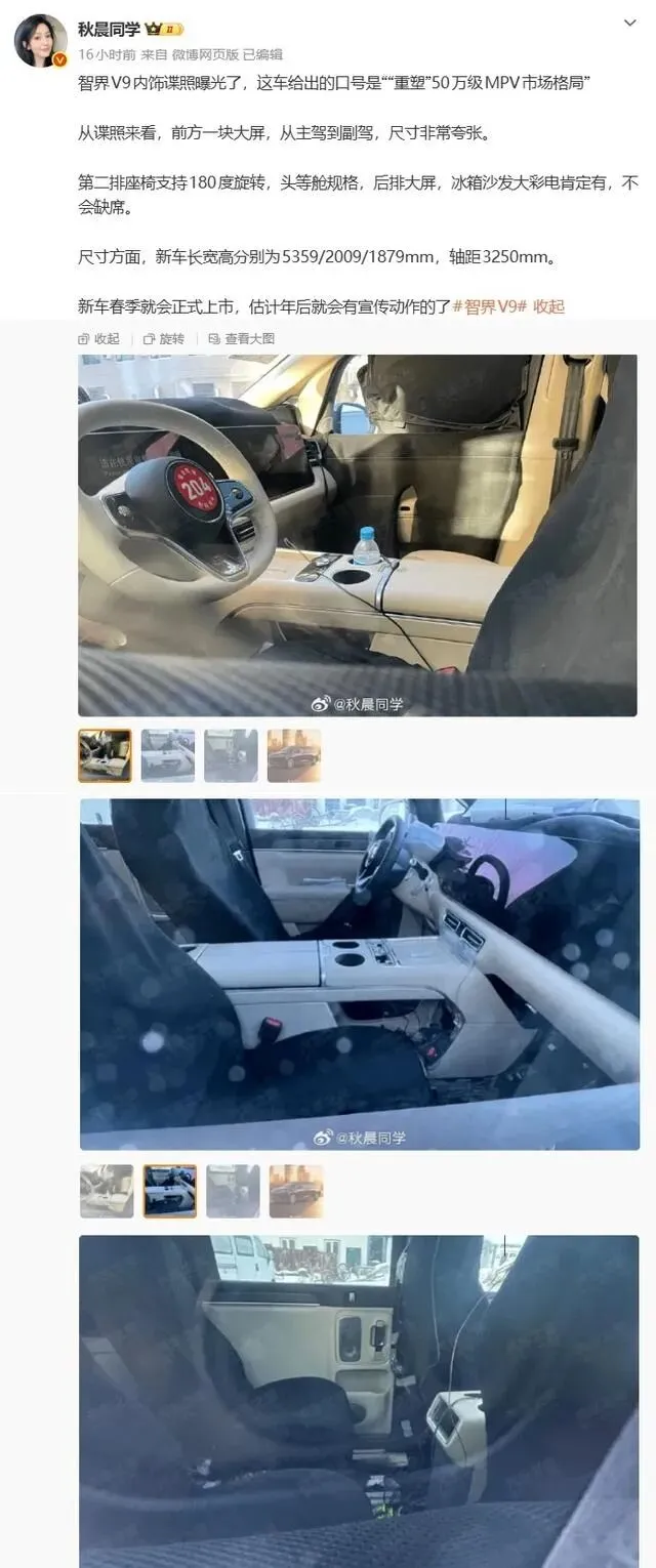 前阵子刷手机的时候,瞅见有个挺熟的博主发了组新车的里子照片,凑近一瞧,嚯,这不就是之前老有人念叨的鸿蒙智行那台旗舰MPV嘛,智界V9的内饰谍照。当时就觉得有意思,赶紧扒拉详细看了看,越琢磨越觉得这车有点东西,跟咱平时聊的那些家用车或者商务车都不太一样,透着股想把舒服和科技揉一块儿的劲儿。